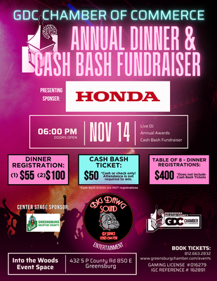 Get ready for a night to remember at Into the Woods, Decatur County's newest event venue as we come together for the GDC Chamber of Commerce's Annual Dinner & Cash Bash Fundraiser! Let's raise a toast to the energetic and thriving Greensburg/Decatur County business community in an evening packed with celebration, fun, and excitement!