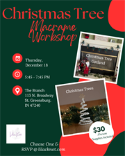 Join us for a cozy evening of creativity and holiday cheer at The Branch in Greensburg, IN! In this hands-on workshop, you?ll get to create your choice of one of two festive macrame projects:
