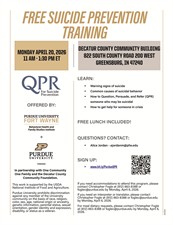 Join us for a training that teaches participants how to recognize the warning signs of suicide, understand common causes of suicidal behavior, and learn how to use the Question, Persuade, Refer (QPR) method to help someone who may be in crisis. Participants will also learn how to connect individuals with appropriate help and support resources. Free lunch will be provided, but registration is required to attend.